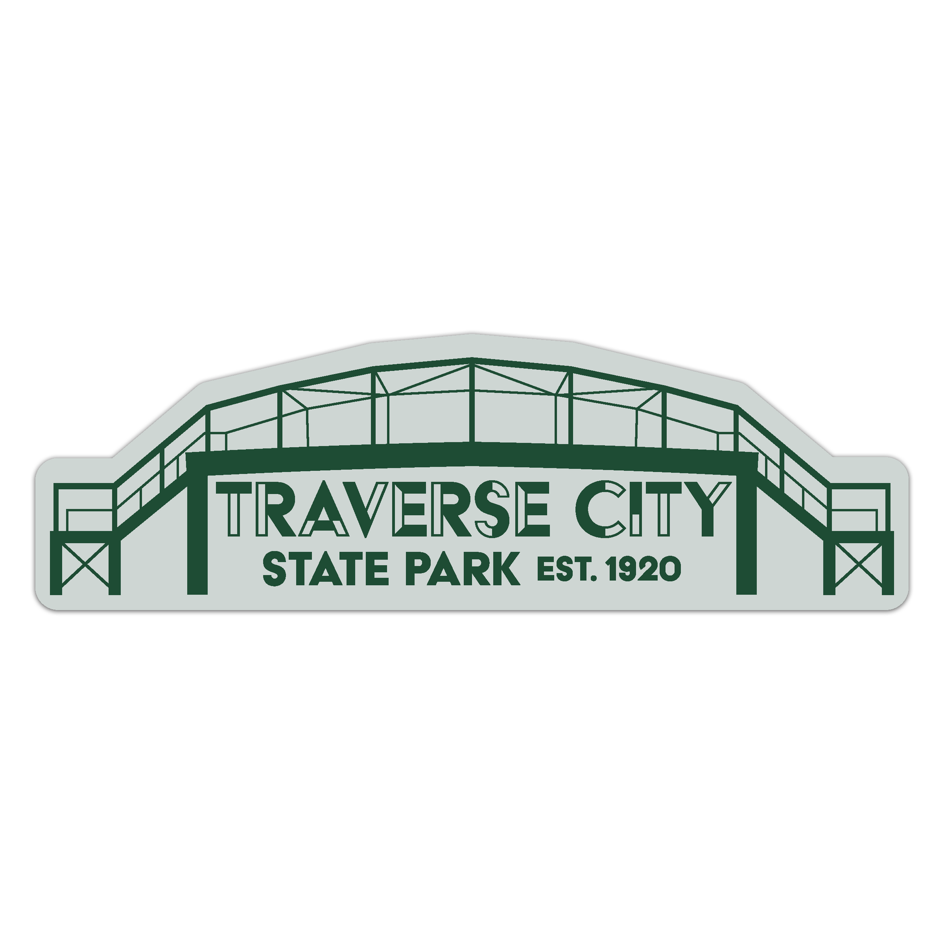 Die-cut sticker with our Traverse City State Park Bridge to the Bay design