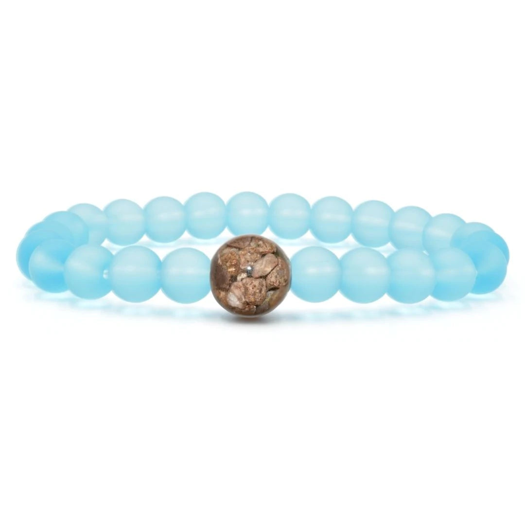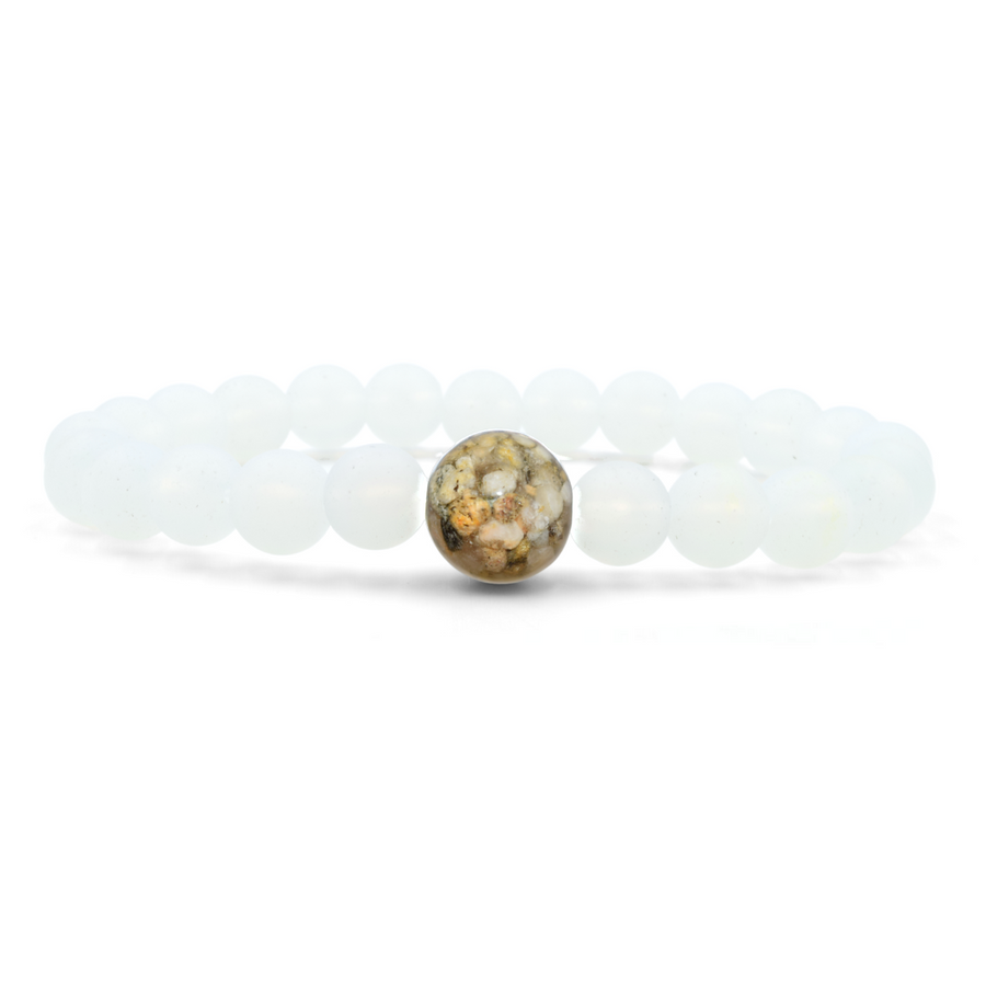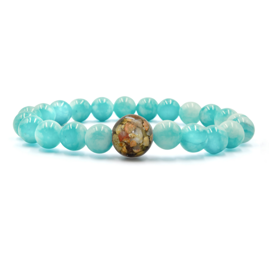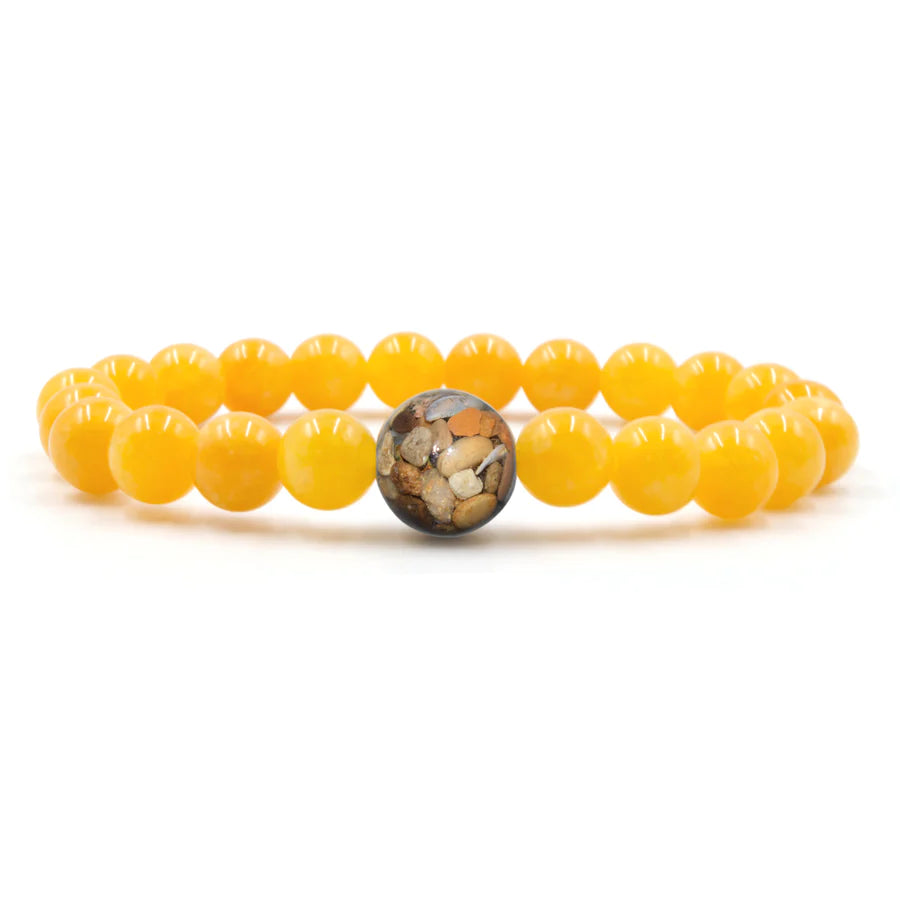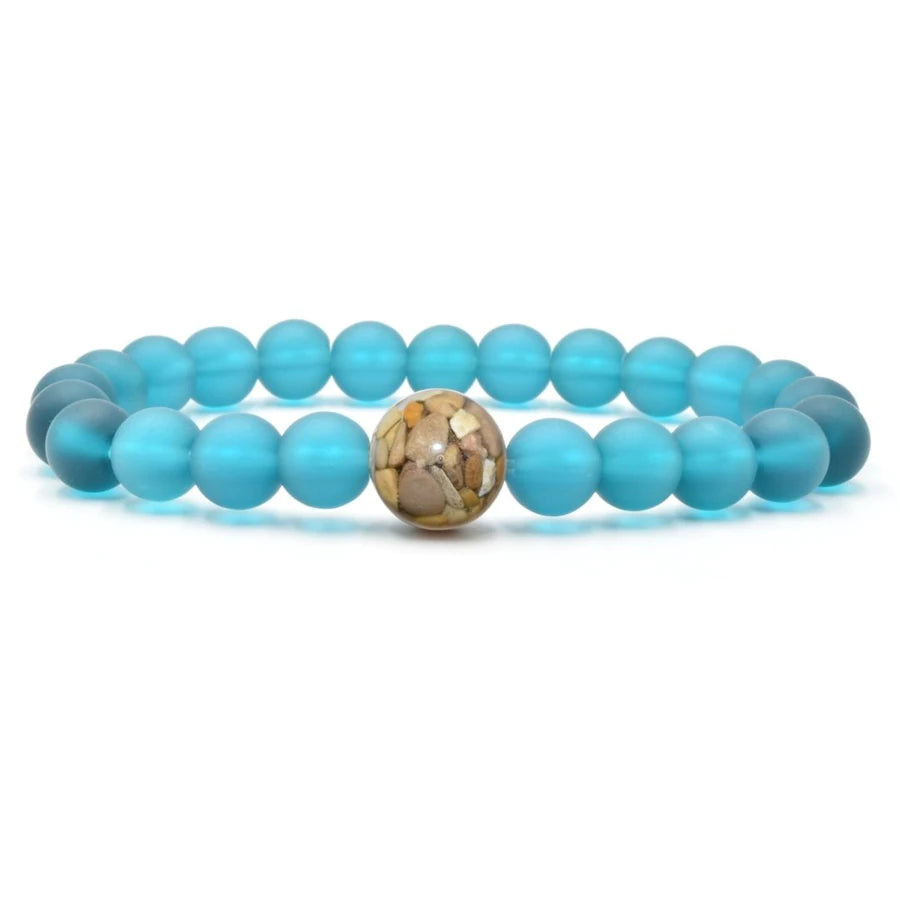 The larger “Earth Bead” of this bracelet contains stones collected by hand from the shorelines of Lake Michigan. Each Earth Bead is hand-crafted in our small shop in Michigan, a process which takes 50+ hours per bead. Each Earth Bead is literally one-of-a-kind.