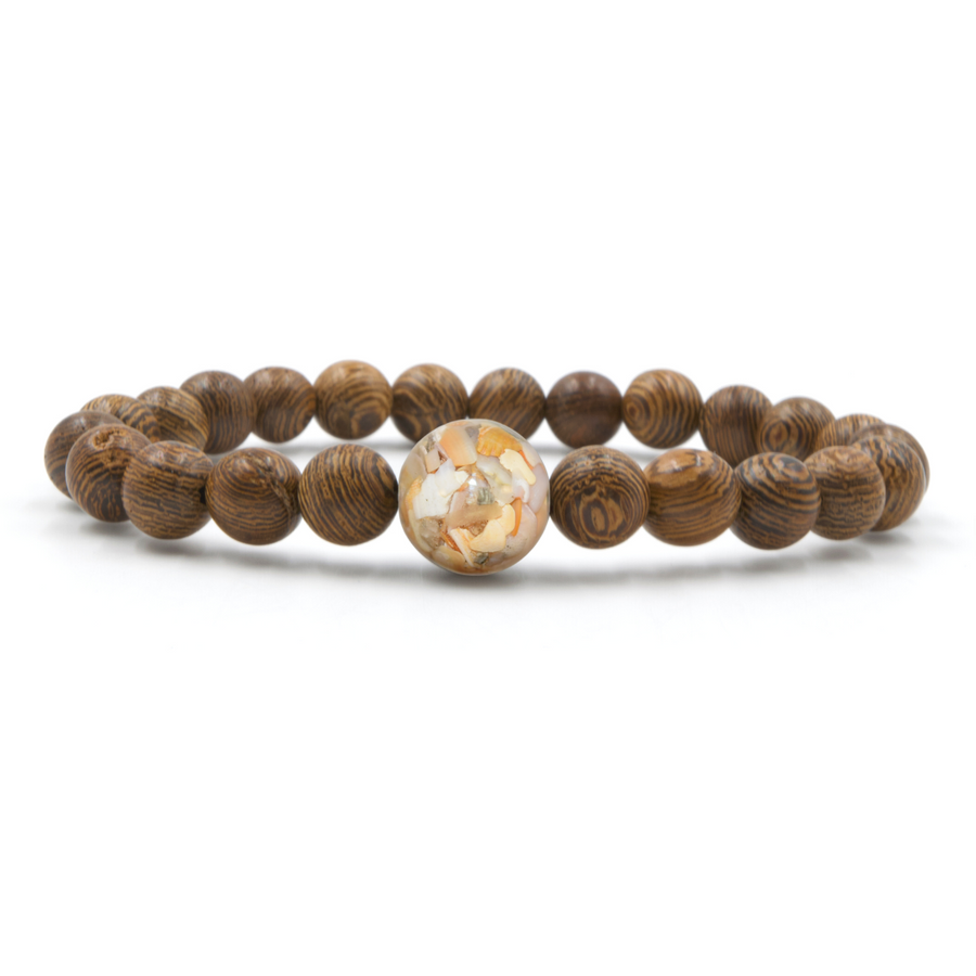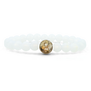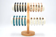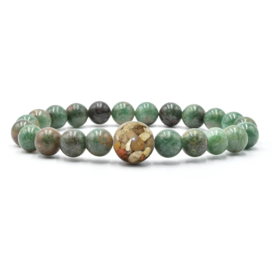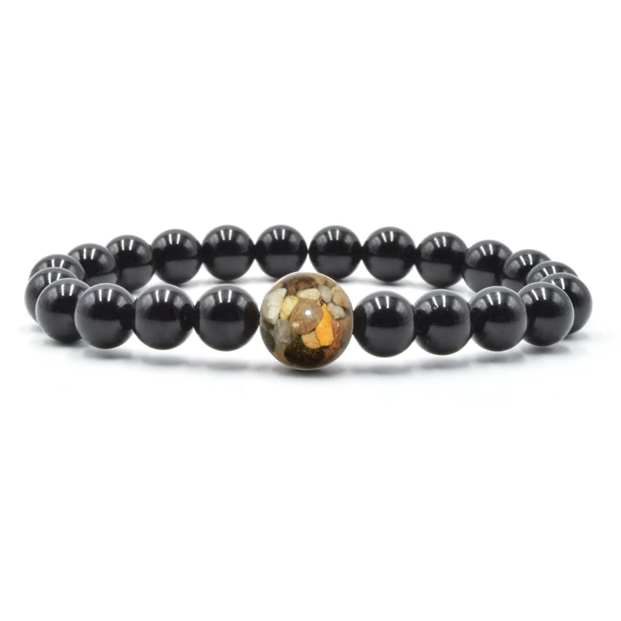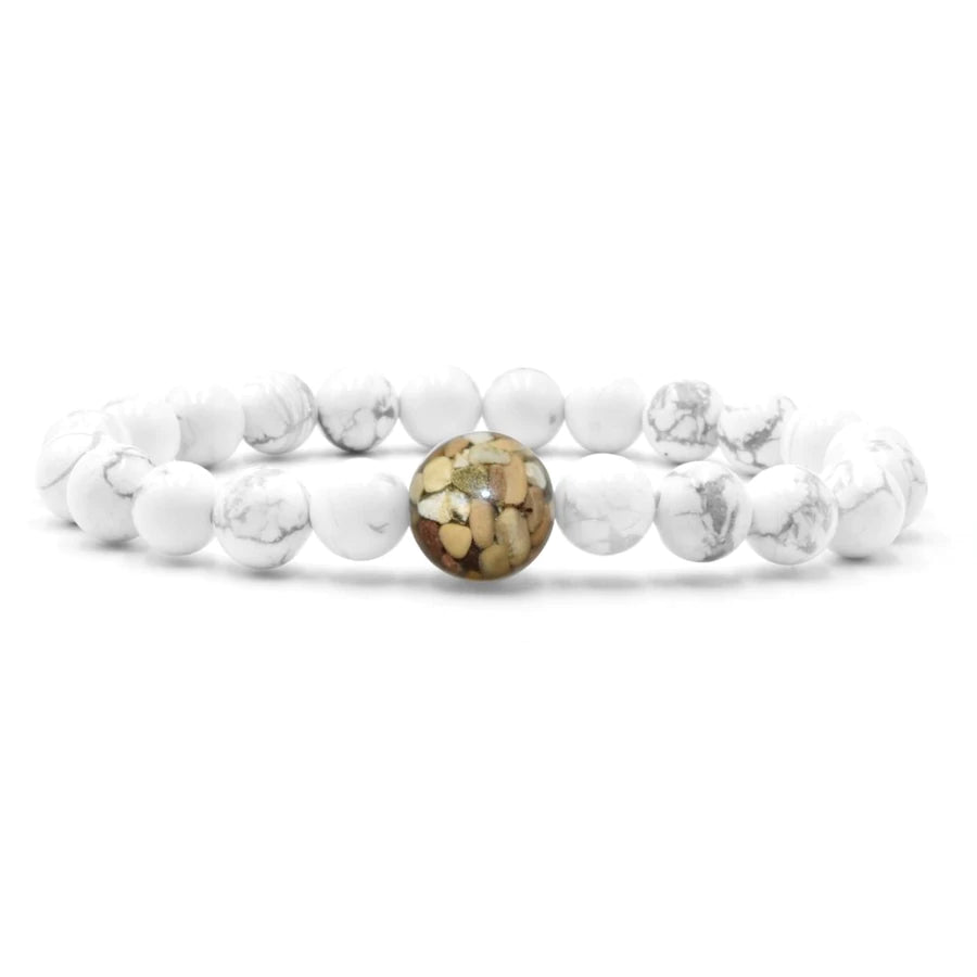 The larger “Earth Bead” of this bracelet contains stones collected by hand from the shorelines of Lake Michigan. Each Earth Bead is hand-crafted in our small shop in Michigan, a process which takes 50+ hours per bead. Each Earth Bead is literally one-of-a-kind.